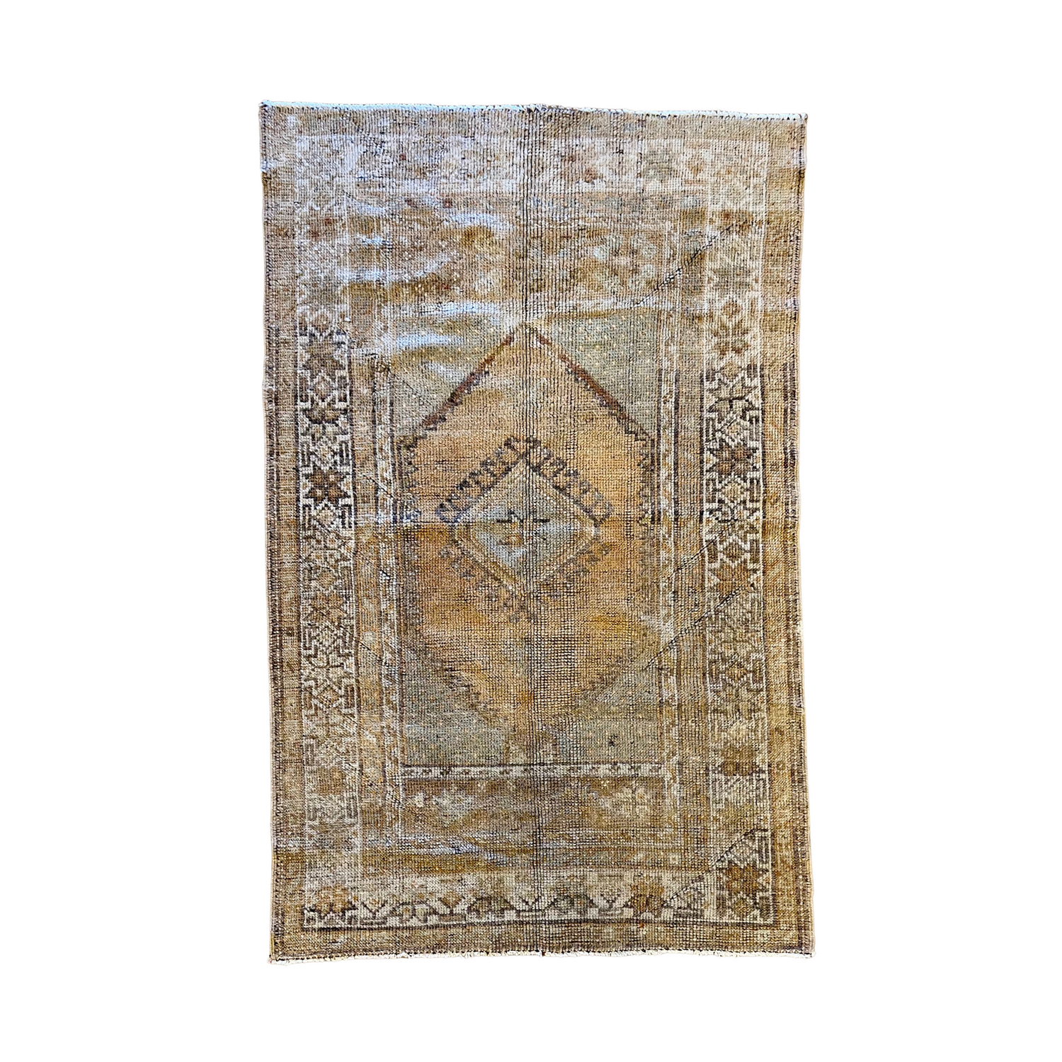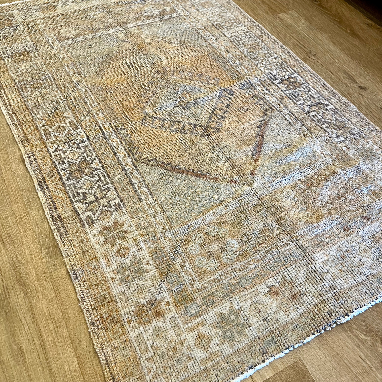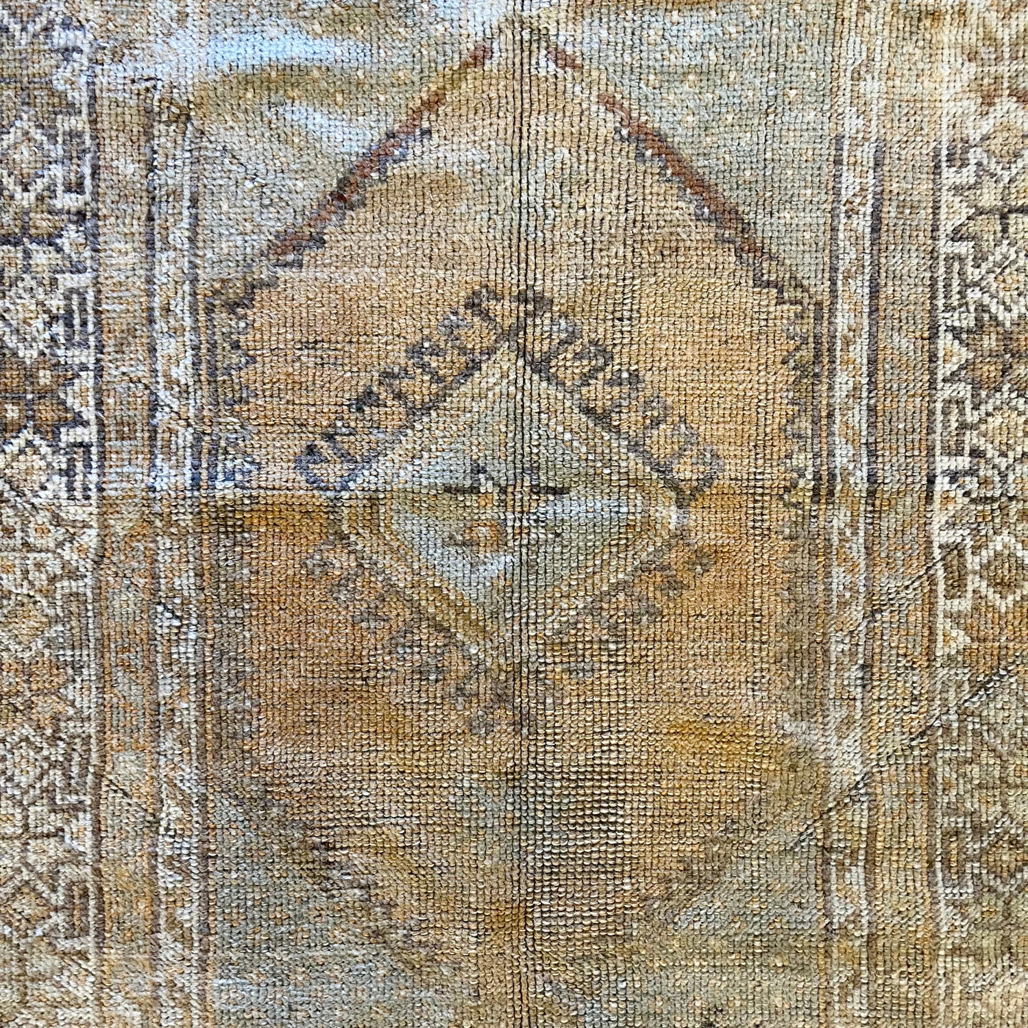 This Anatolian Turkish oriental rug is hand woven using champagne, blue, and tan threads. Made out of 100% wool.