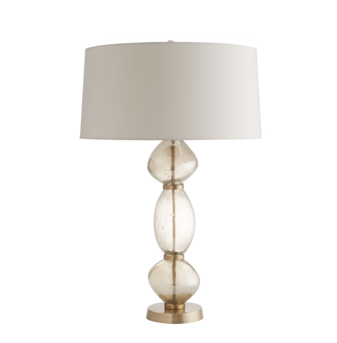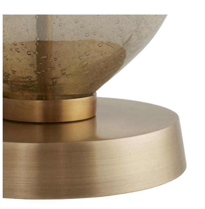 The Dreena presents a stacked foundation of overt organics that is quite alluring. Seedy glass is blown by hand creating the unexpected shapes that form along an antique brass frame. Each organic orb is accented with an antique brass ring breaking up its curvaceous silhouette. A smoke luster finish takes the design to the next level. Topped with a pewter microfiber drum shape. Finish will vary.