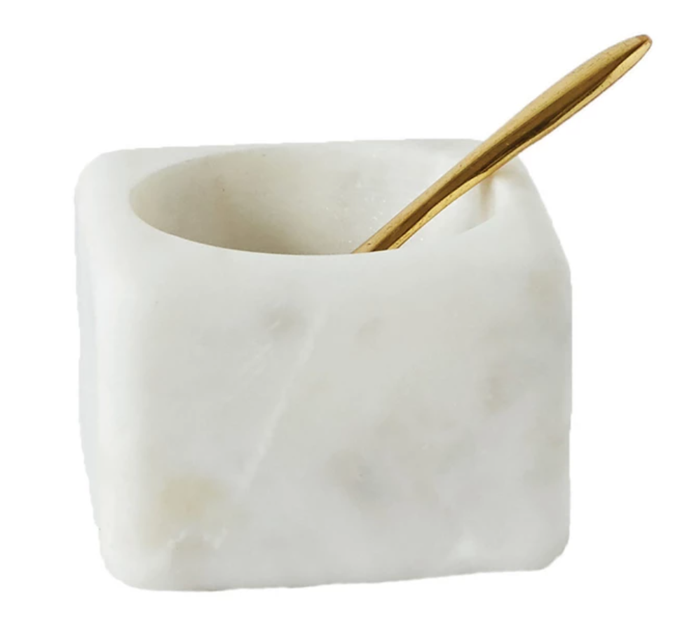 When adding marble to your table decor, it always adds an extra touch of class. This marble bowl is square with a round opening. It comes with a brass spoon.
