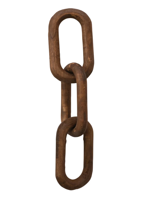 This wood chain is the perfect accessory to any home. It is made out of reclaimed wood and has 3 links. This product is perfect for putting on shelves, in a bowl on a coffee table, or anywhere in your home to add depth and warmth. This piece has many different possible uses, but each of them will bring style to any room.